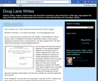 So I pulled a Mercury, turned retrograde, and blew the dust off Blogger, previous home of a couple of short-lived blogs, to establish the new iteration of the Doug Lane Writes blog, with a desire to push something out once-a-week to keep the wheels greased. The goal is fresh blog every Tuesday. Of course, I missed this Tuesday.But click the button in the right-hand column or the top banner navigation for BLOG to go there, and watch your socials for future update announcements!