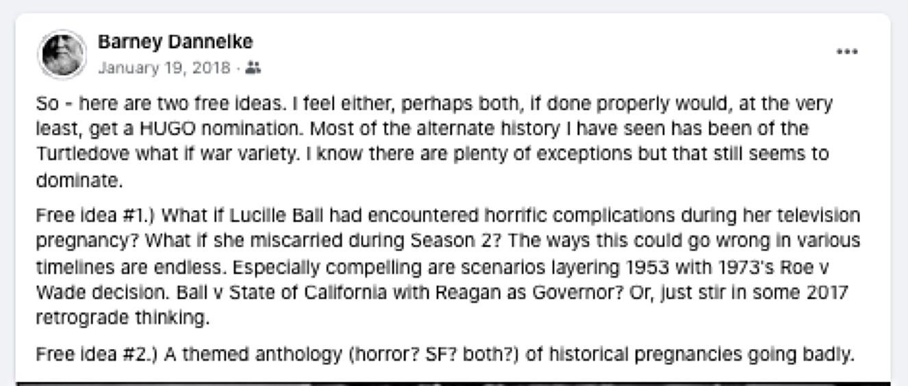 The first rule of alternate history stories is figuring out whether or not your idea dovetails with established fact. It's one thing to posit that Lucy losing her baby causes something to happen, but the something still needs to fit the framework of everything that came before the change. In Lucy's case, as both the central figure of a television series and someone whose pregnancy was mirrored in the show, there were logistics and details aplenty with which the idea needed to interlock. Fortunately, the shows has been thoroughly documented from just about every conceivable direction. As I dug into the filming logistics, the plan for the pregnancy episodes, and Lucy's planned birth, I saw an almost glove-like fit for the pivot from reality to its alternative.
