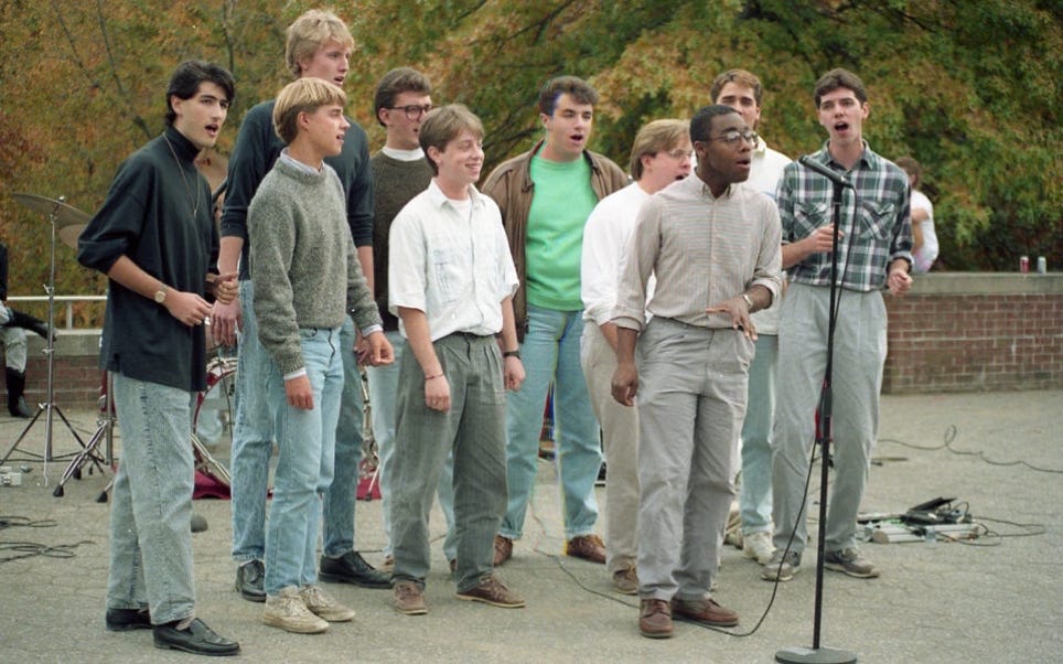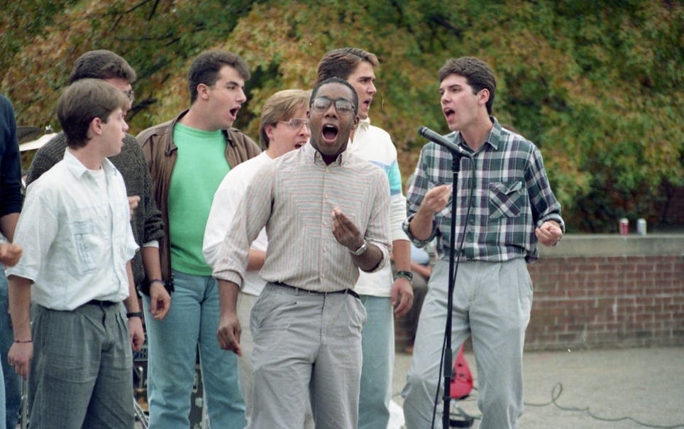 I first noticed him as a singer — it was Freshman Orientation at SUNY Binghamton; my parents and I were lunching in the College In The Woods dining hall, and the Binghamton Crosbys stopped in to perform. The Crosbys are the all-male a cappella group at Binghamton. He didn’t have a lead, but the group impressed. I’ve still got all but one of their albums. I also have a couple of… gray area recordings, but we’ll get to that.